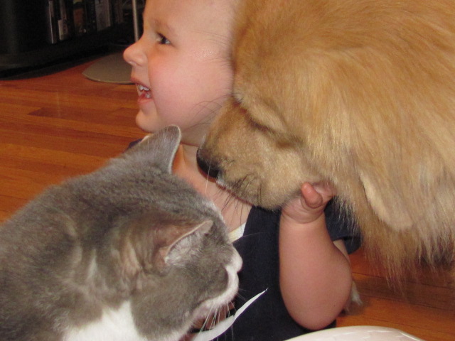 Young Robert discovered that if he puts food on the seat of the recliner next to him, Barkley will lean his furry little head over the arm of the chair to get even the smallest morsel of food. This puts the poor dog in an excellent position to be grabbed by the sticky hands of an ebulient one-year-old. And the poor dog was remarkably tolerant of this as Robbie pulled at his ears, looked at me, and grinned from ear to ear.