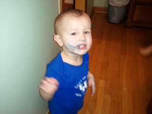The entire right side of Robbie’s face was covered in teal marker. I’m not sure why the first move after uncapping a marker is always the face, but it is at the Manna house. I went into the bedroom, hoping to discover what marker Robbie had used. I won’t lie; I was relieved to see that the marker wasn’t on my bed seeping onto my new duvet cover. Robbie had kindly placed it back in the top drawer of my nightstand. It was a Sharpie.