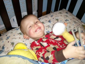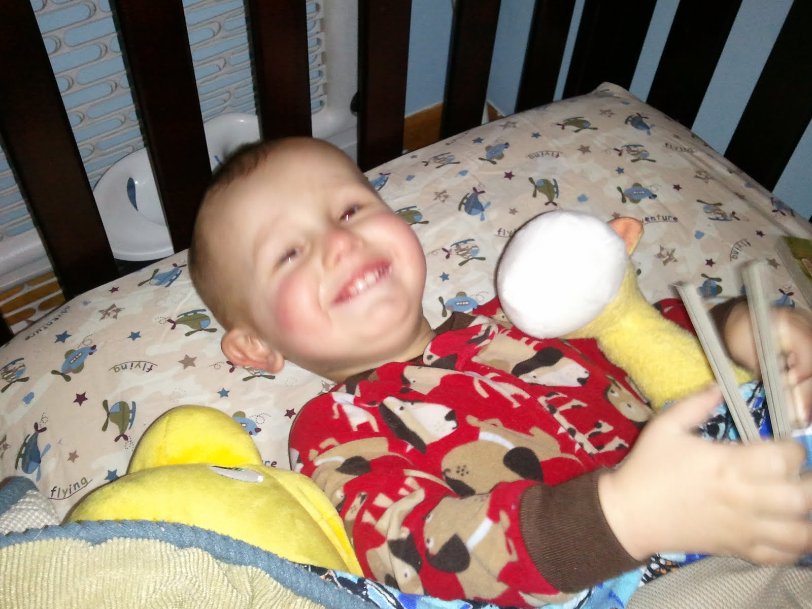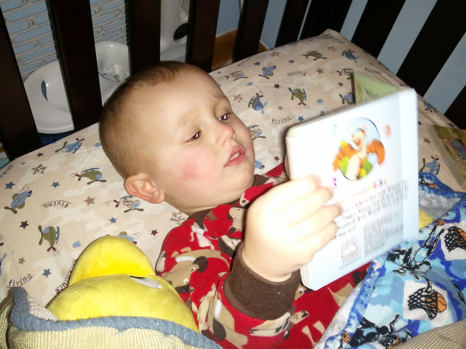 Robbie turned, looked at me like I was crazy, ran to me, crashing into my legs with a big hug and a huge grin. He nearly leapt into my arms and sat through all three books. And then it was time for bed. Robbie went happily into his crib (after feeding Ish, of course). He grabbed Moo, his giraffe, and laid down. Robbie rolled over, grabbed another book, and immediately got to reading.