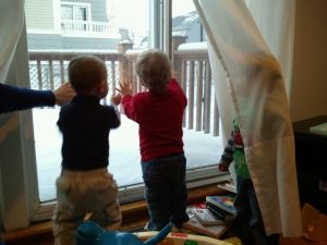 Unfortunately, no one could go outside to play. They just licked the window and played hide-and-seek with the curtains instead.