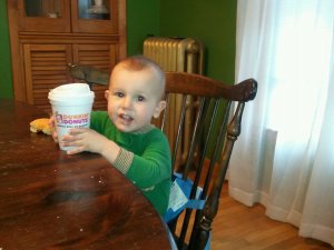 I got home, and Justin and I got everything set up for breakfast in just a few minutes. Then Roberto saw the coffee. And screamed and screamed. He did not want his donut. He did not want his milk. No, my child wanted the styrofoam cup. In an effort to stop the screaming and ease the headache I could feel forming at my temples, I got a mug for my coffee and poured Robbie’s milk into the Dunkin’ cup. I leaned back in my chair, happy to have avoided the near-crisis.