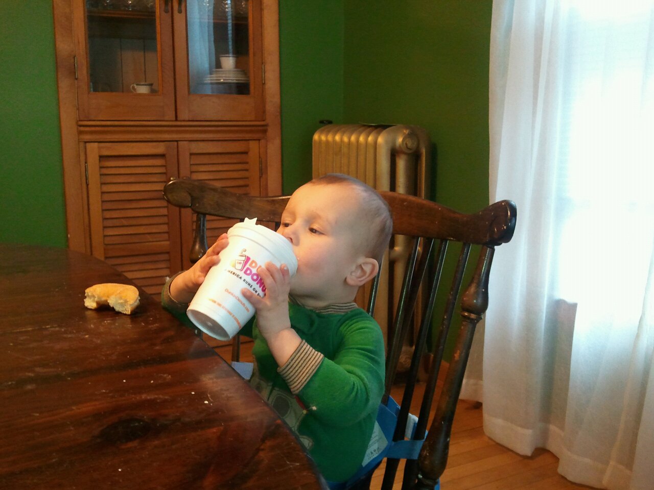 Robbie happily grabbed his big boy cup, brought it to his lips, and took a sip. He looked at me, frowned, and said, “Nait nait. NO nait nait.” Justin and I looked at each other, unsure of what to do. We both shrugged our shoulders. I took the cup back, emptied out most of the milk, and poured in a little coffee. It was exactly what he wanted. My nineteen-month-old son had a hankering for a morning cup of joe. I may have to start ordering decaf if he keeps this up…