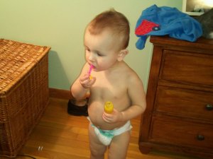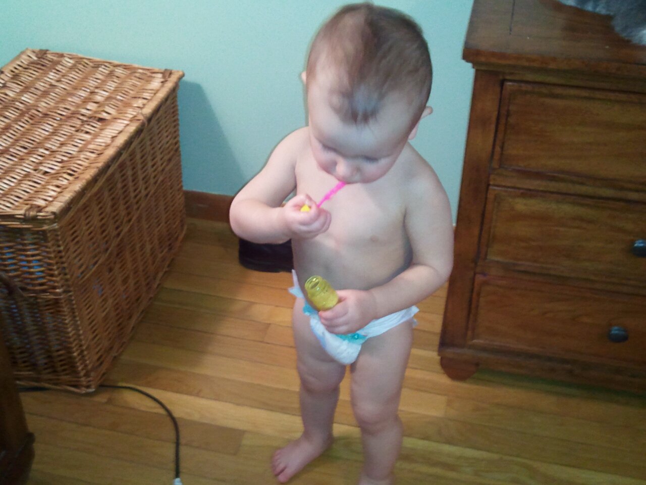Even though it isn’t anywhere near summer (or, in all honesty, spring, for that matter), I couldn’t pass up the 99 cent bubbles at Target last weekend. But, like any harried woman, I forgot I even bought them. Until Robbie found them in the bag on his changing table.