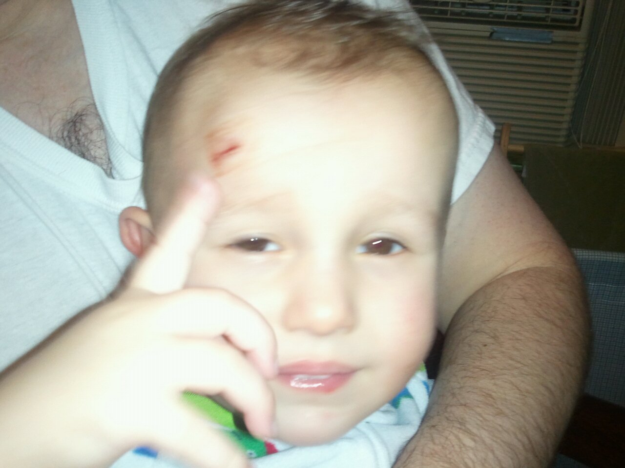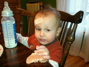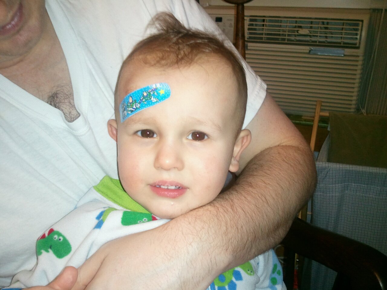 After Justin left, Robbie grabbed a metal Matchbox car, his favorite toy. He ran around daycare like a madman and tripped. As he went down, he landed on the car. And the car kept going. All the way into his forehead.
