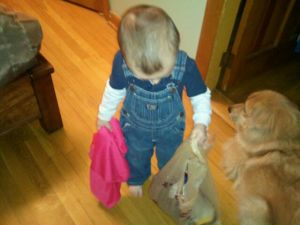 Our morning started off with Robbie looking to help again. He got my gym clothes together in a bag. And then took them out and threw them around my bedroom. As soon as I had them re-bagged, he told me he wanted to help and carried the bag across the street to the grocery store, around the grocery store, and halfway back across the street. And then he dropped the bag as traffic was coming in both directions.