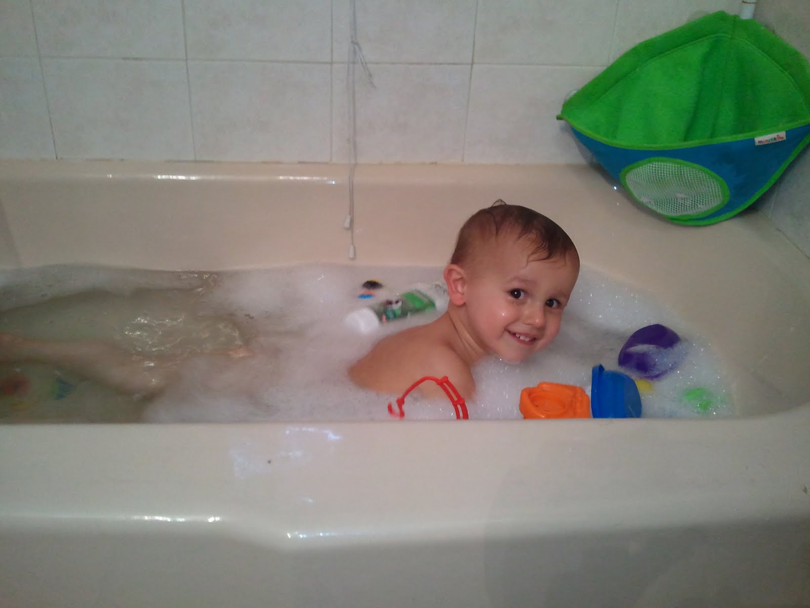 Rob loves the bath. Has for a long time. He loves sitting in the bath, standing in the bath, playing in the bath. Oh, and drinking the bath water. But he does not like to swim in the bath, or, as he puts it “sim”. Until last week (I know, I’m really behind on the blogs!).