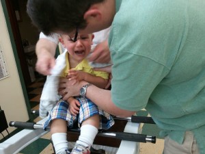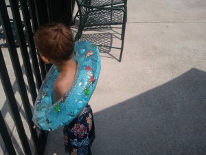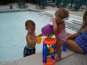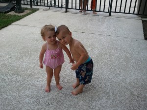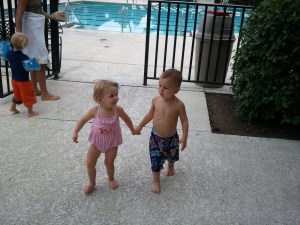 The boys were beyond excited to see each other. I had to cajole Robbie into his swim diaper before he was allowed to greet Pete with all the enthusiasm of a pent-up puppy. They babbled incoherently, playing with the cats and dog. They squealed with excitement when they realized they got to ride in a car next to each other.
