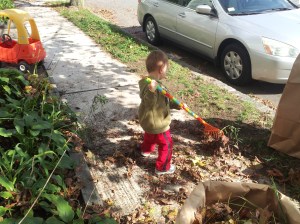 We stopped for coffee after our run and evaluated our choices for the day. Since it was so gorgeous, we decided the day called for a little yard work. Two days of downpours left a lot of leaves in our yard, and our back door needed a second coat of paint. Between the three of us, we finished the work in less than an hour. Yes, the three of us. On our way home, we stopped by the hardware store to pick up some supplies. At the checkout, I found a child’s rake. Having experienced yard work with Robbie, I know it’s best if he has his own tools. Trust me. It was $9.99 very well spent. For the most part.