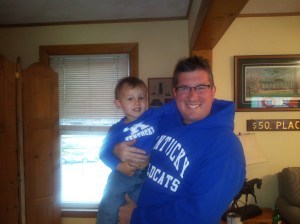 Later in the day, after everyone’s afternoon nap, we got dressed to run errands. Robbie saw that I was wearing a UK shirt (with crying Louisville fans on the back) and insisted he be outfitted in Go Cats gear. After he got dressed, Justin came upstairs to check on our progress. Robbie took one look at his father and could barely contain his disgust. He marched over to Justin, pointed at Justin’s shirt, and said, “Daddy, Go Cats shirt. Daddy, shirt. Cats.” And what was Justin supposed to do? He went and changed clothes and we looked like “that” family in the coordinating outfits for the evening.