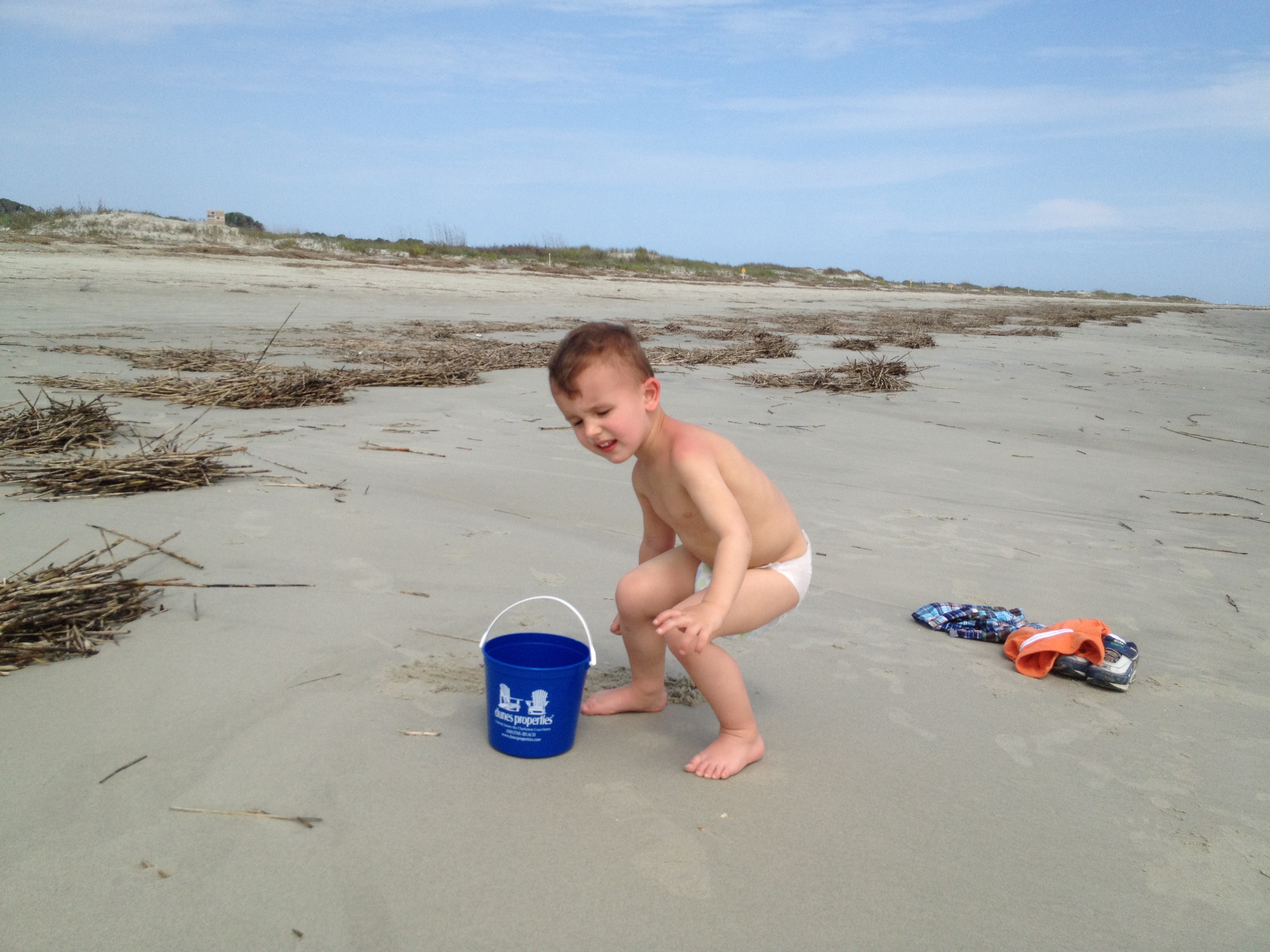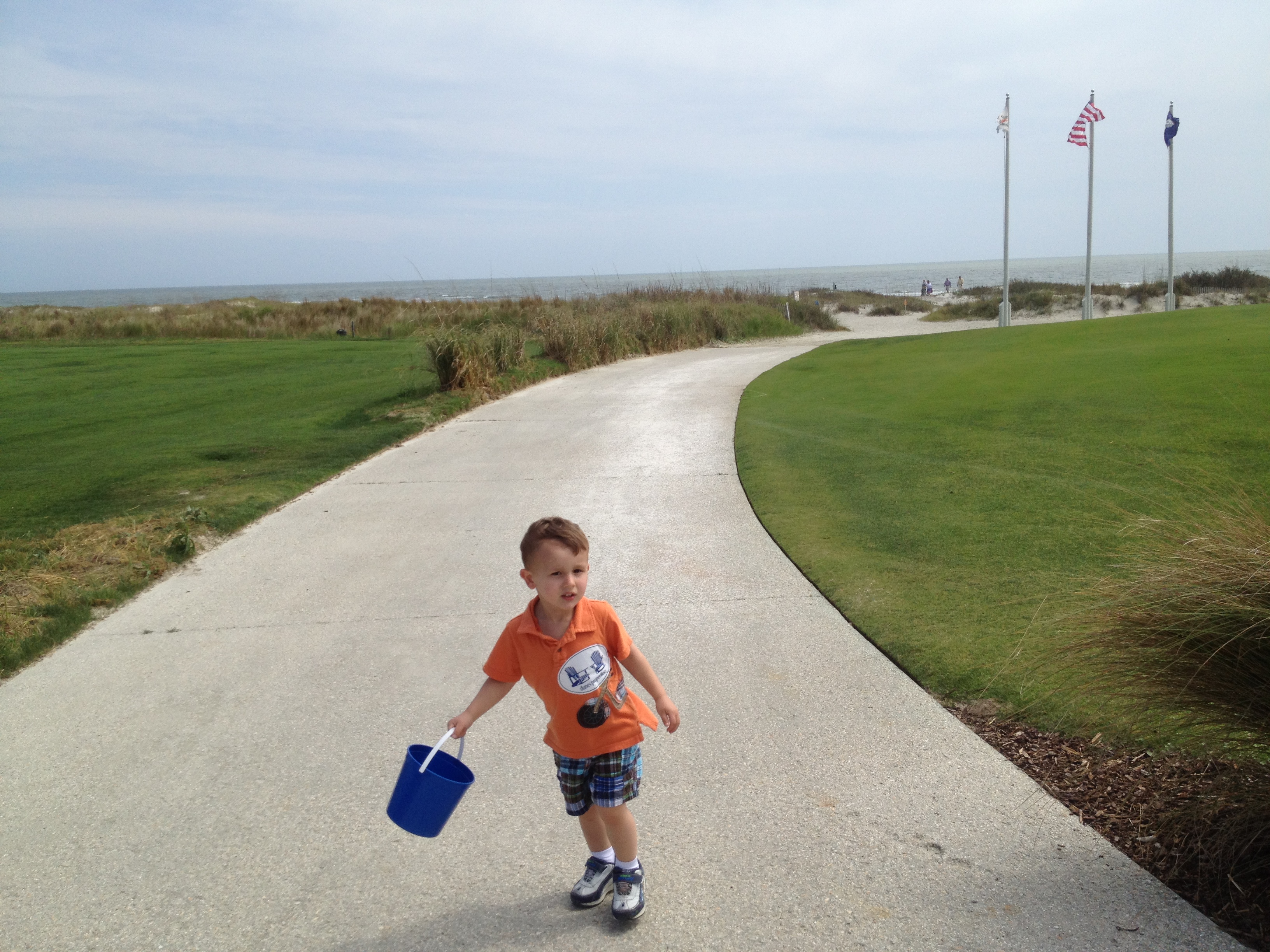 Robbie immediately grew bored with looking at the golf course and reminiscing about Justin’s adventures on Kiawah over college spring breaks (think golf cart mishaps and the like) and decided that he and his (second) lucky bucket needed a trip to the beach. We happily left Justin and Pat sitting in rocking chairs on the clubhouse porch and headed for the beach.