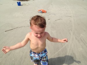 That, however, was not the end. Robbie then insisted that his shirt come off. I hesitated at this because (bad parent alert here!) Robbie’s shoulders were a little sunburned from yesterday (perhaps due to his inability to realize what a good thing he has with spray sunscreen and failure to stand still). But, who am I to deny a boy his right to be shirtless on the beach?